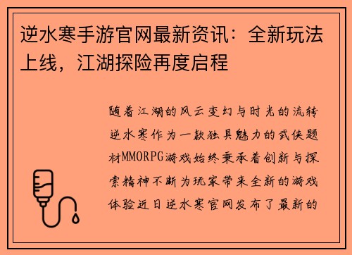 随着江湖的风云变幻与时光的流转,《逆水寒》作为一款独具魅力的武侠题材MMORPG游戏,始终秉承着创新与探索精神,不断为玩家带来全新的游戏体验。近日,逆水寒官网发布了最新的游戏资讯,宣布全新玩法上线,江湖探险再度启程。这一全新玩法不仅让玩家们再次踏上了充满未知的江湖冒险,也为游戏注入了更多的活力与深度。文章将围绕逆水寒官网最新的资讯,从四个方面进行详细分析:全新玩法的亮点、玩家互动的创新机制、游戏世界的拓展与深化、以及未来可能的更新与发展方向。这些内容将帮助玩家全面了解这次更新所带来的变化与挑战。